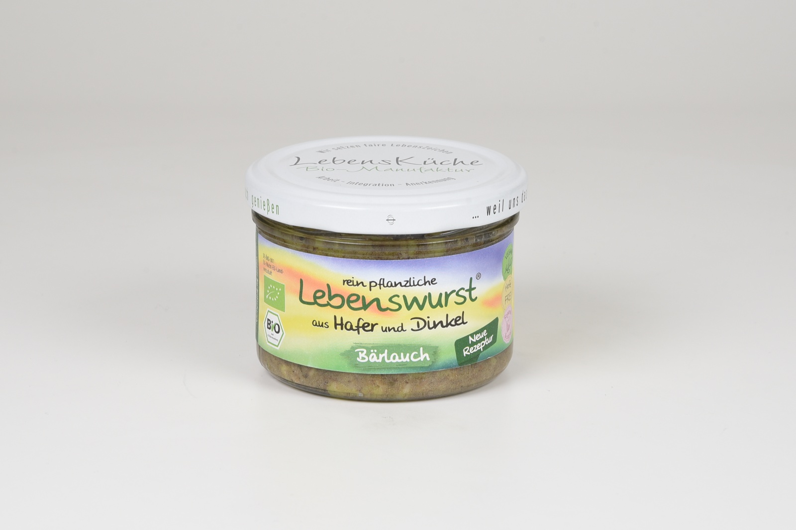 Die Lebenswurst 'Bärlauch' ist ein veganer Brotaufstrich mit frischem Frühlings-Bärlauch verfeinert – handgeplückt im Maßbacher Naturwald! Im 200g Glas.