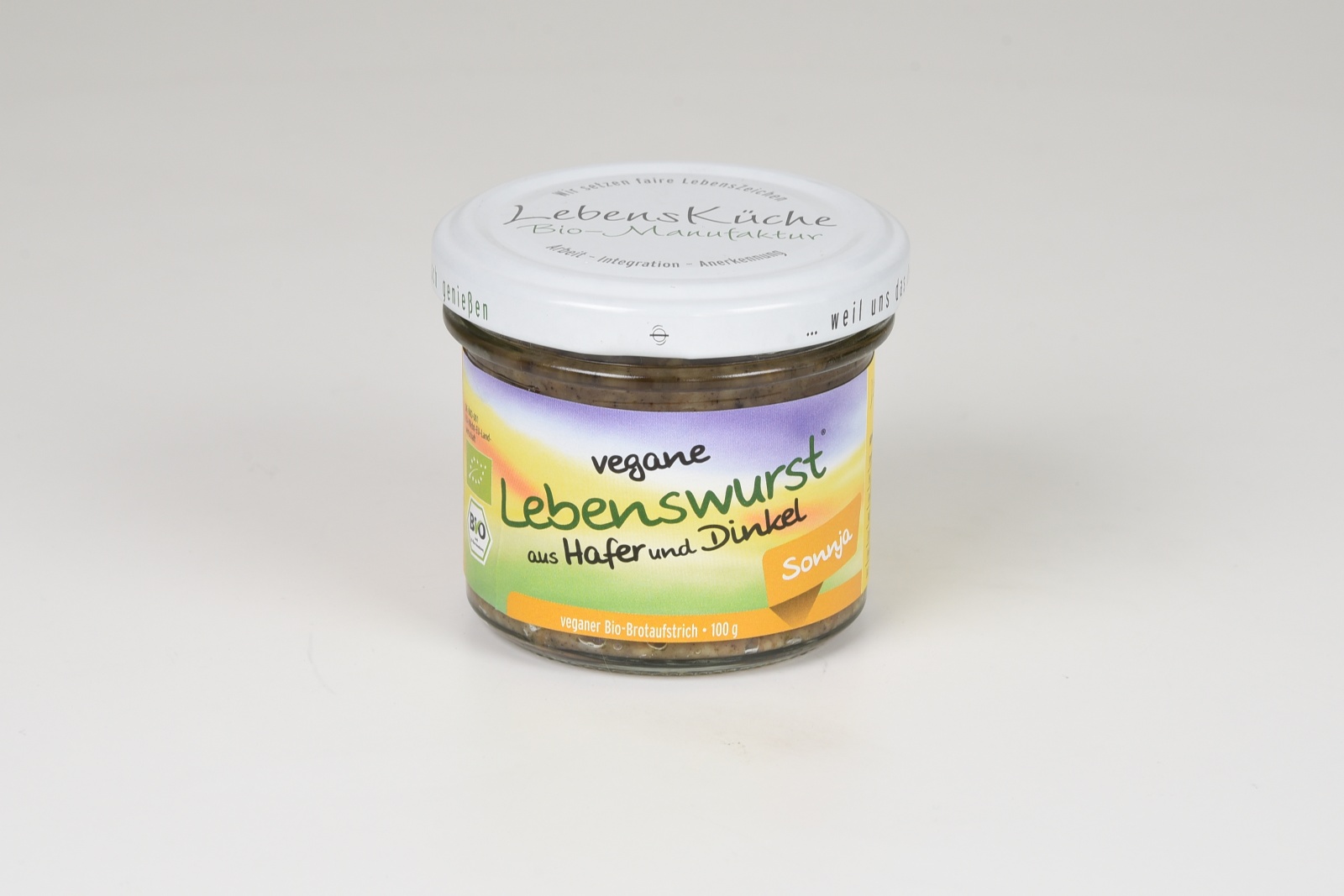 Die Lebenswurst 'Sonnja' ist ein veganer Bio-Brotaufstrich und enthält reines kaltgepresstes, biologisches Sonnenblumenöl aus der ersten Pressung.